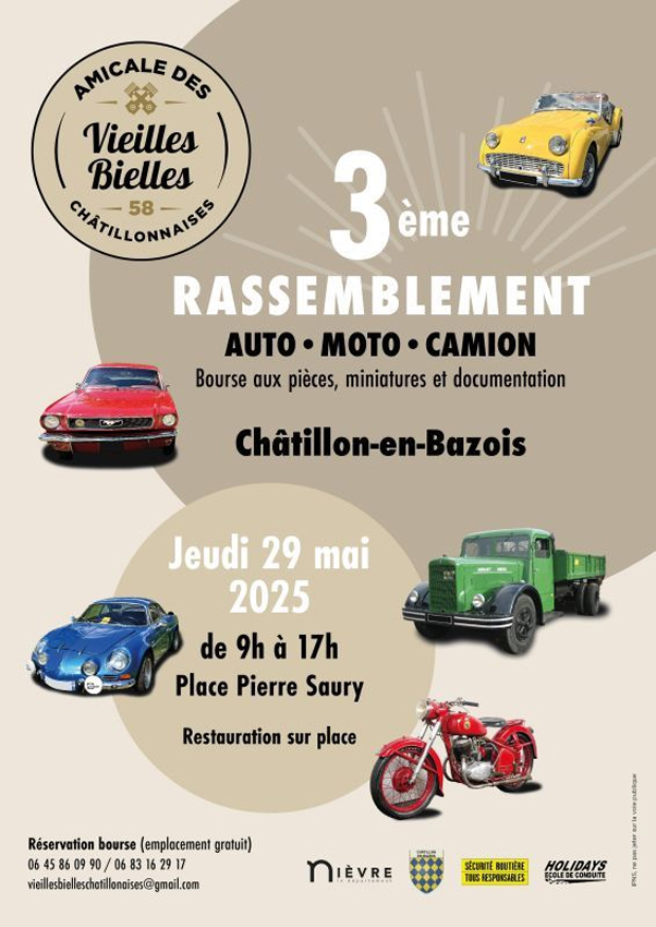 Rassemblement de véhicules anciens et bourse aux pièces L'Amicale des Vieilles Bielles Châtillonnaises organise son 3ème rassemblement de véhicules le jeudi 29 mai 2025 dès 09h00 sur la place Pierre Saury à Châtillon-en-Bazois (58). Cette concentration accueille des autos, motos et camions allant de 1900 à 1980. Tous les thèmes sont les bienvenus : customs, sportives anciennes, pompiers, militaires, caravaning. Une bourse d'échanges de pièces détachées, de miniatures et de documents est également organisée. Restauration sur place. Entrée gratuite.