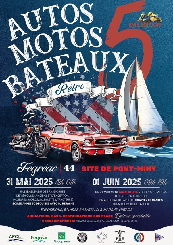 Rassemblement de véhicules anciens et d'exception L'AFCL organise un rassemblement de véhicules anciens et de prestige les 31 mai et 1er juin 2025 sur le site de Pont-Miny à Fégréac (44). Cette concentration accueille des voitures, des motos, des mobylettes, des tracteurs. Le 1er juin respecte le thème de "Made in USA" en proposant des véhicules américains, autos et motos, d'hier et d'aujourd'hui. Diverses animations dont une soirée année 80 déguisée avec DJ ainsi que des balades en moto ou en bateau, train touristique gratuit, expositions et marché vintage.. Bars et restauration sur place. Entrée gratuite.