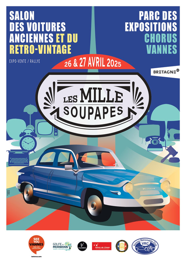 Exposition annuelle de voitures et motos Vannes Rétromobile CLub et Le Parc des Expositions Chorus organise la 3ème édition du Salon Les Mille Soupapes les samedi 26 et dimanche 27 avril 2025 au parc des Expositions Chorus à Vannes (56). Ce salon propose une exposition de voitures et motos ainsi qu'une exposition-vente de véhicules de collection. Une vente aux enchères est également organisée ainsi qu'une zone réservée à une bourse d'échanges de pièces détachées et objets de décoration. Un autre espace est dédié à un salon vintage. Une projection de films en plein air est programmé en fin de journée le samedi suivi d'un bal Swing. Les propriétaires de véhicules peuvent participer à un rallye touristique le samedi et/ou une balade parade le dimanche. Parking dédié aux visiteurs en véhicules anciens. Informations complémentaires ou inscriptions uniquement et seulement auprès de l'organisateur Vannes Rétromobile Club