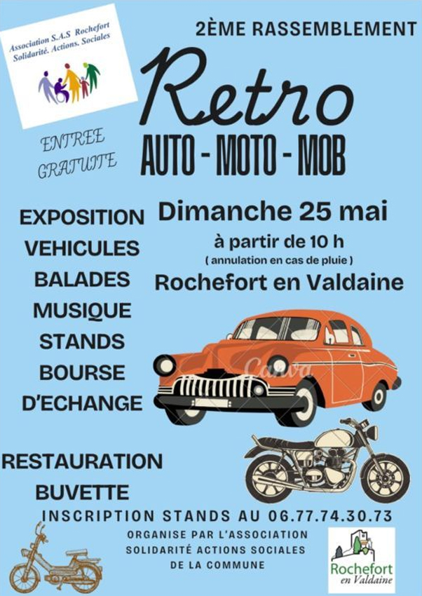 Rassemblement annuel de véhicules anciens L'Association Solidarité d'Actions Sociales organise la 2ème édition de leur concentration annuelle de véhicules anciens le dimanche 25 mai 2025 dès 10h00 à Rochefort en Valdaine (26). Cette concentration est ouverte aux autos. motos, mobylettes anciennes, de collection ou de prestige. Les animations comprennent des balades régionales, de la musique, des stands d'exposants ainsi qu'une bourse d'échanges. Restauration et buvette sur place. Entrée gratuite.