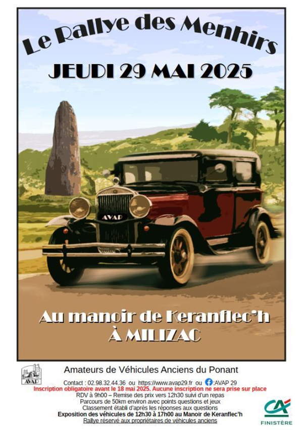 Rallye touristique pour véhicules anciens et exposition Les Amateurs de Véhicules Anciens du Ponant organise le Rallye des Menhirs le jeudi 29 mai 2025 depuis le Manoir de Keranflec'ch à Milizac (29). Ce rallye touristique débutera à 09h30 avec des départs toutes les minutes dans les deux sens de la boucle. Le participant s'oriente à l'aide d'une carte pour un parcours de 50 km afin de retrouver les 3 points question et les 2 poinçons. Il ne s'agit pas d'une compétition de vitesse. Le classement sera établi en fonction des réponses aux questions. Le rallye finit à 12h30 et est suivi d'un apéritif ainsi qu'un repas. Les véhicules sont exposés de 12h30 jusqu'à 17h00 afin de permettre aux visiteurs de venir les admirer. Inscription préalable obligatoire et payante. Aucune inscription sur place.