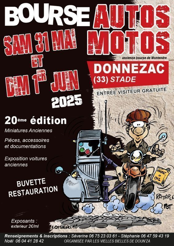 Bourse d'échanges annuelle d'objets liés à l'automobile Les Vieilles Bielles de Doun'za organise la 20ème édition de bourse d'échanges autos motos, anciennement bourse de Montendre, le samedi 31 mai et le dimanche 1er juin 2025 au stade de Donnezac (33). Cette bourse annuelle propose des autos et motos anciennes, des miniatures, des documents techniques, des pièces détachées et des accessoires. Un autre espace est réservé à un vide grenier et des animations pour les enfants. Une exposition de voitures anciennes d'avant 2000 est organisée en parallèle. Buvette et restauration sur place. Entrée visiteur gratuite